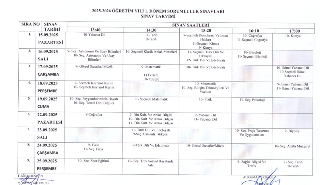 1. DÖNEM SORUMLULUK SINAVLARI SINAV TAKVİMİ