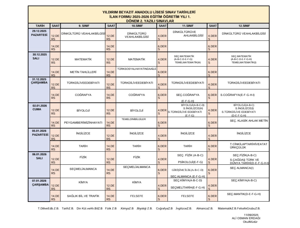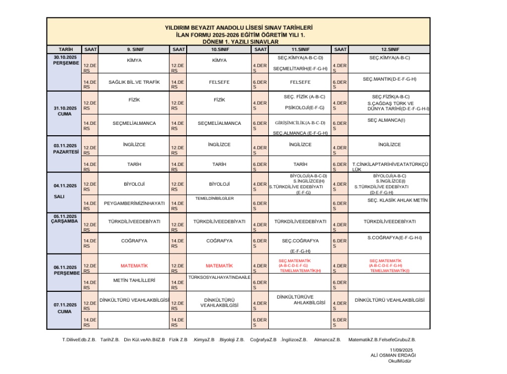 1. DÖNEM YAZILI SINAV TARİHLERİ